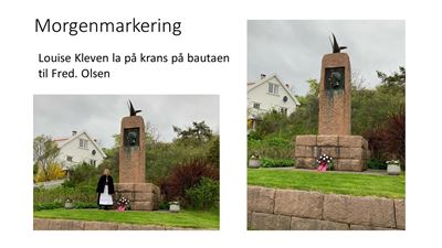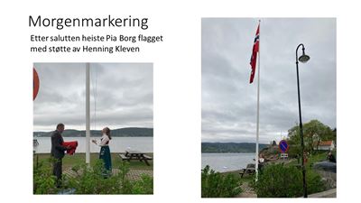 Starten på dagen. Vestby forsvarsforening fyrte av 3 salutter kl. 08:00. Flagget ble heist av Pia Borg med bistand fra Henning Kleven til trompetfanfare av Trond Martinsen etterfulgt av "Ja, vi elsker". Hele markeringen ble veldig stemningsfullt. Louise Kleven la på krans ved bautaen til Fred. Olsen.