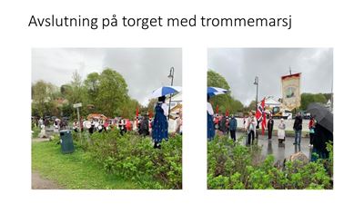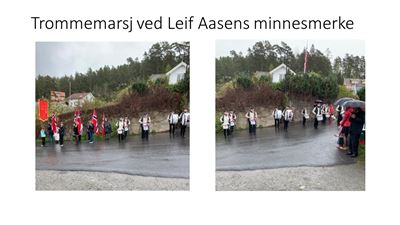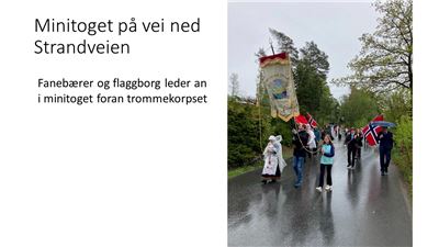 Minitoget gikk ned Strandveien (fra krysset ved Ødegårdsveien) til torget. En stor takk til Hvitsten trommekorps som stilte opp og spilte for oss. Simon Strugstad bar fanen og Lucia Waagbø og Mali Gjeraldstveit som bar duskene. I flaggborgen deltok: Ylva Melkeraaen Lundell, Christian Ustvedt, Antoni Lukasz, Harald Ivo Brænna, Gard B. Johansen og Samson Waagbø. Vi syns det er spesielt hyggelig at ungdom i Hvitsten deltar i flaggborgen og fanebæring. Louise Kleven la ned krans ved Leif Aasen sitt minnesmerke på veien ned til torget.