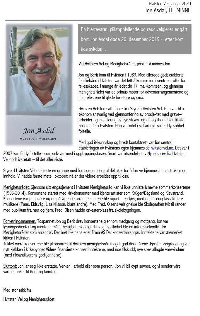 Den milde vinteren er som bestilt for oss som priser bar bakke og stødig fot. Med kroppen i behold kan man jo alltids oppsøke skianleggene og de uimotståelig vakre hvite vidder. Nå er Hvitsten en perle i vinterdvale …… når bare våren titter frem, gjør vi det også. Vi gleder oss usigelig til lengre dager, blåveis i veikanten, sommer og sol, pubtreff, konserter og lyse varme kvelder.