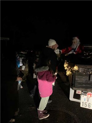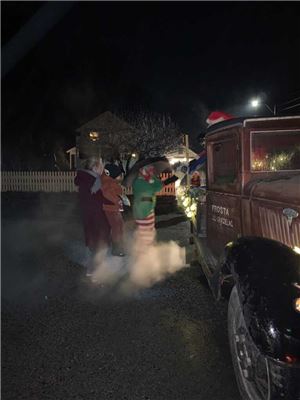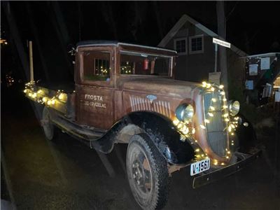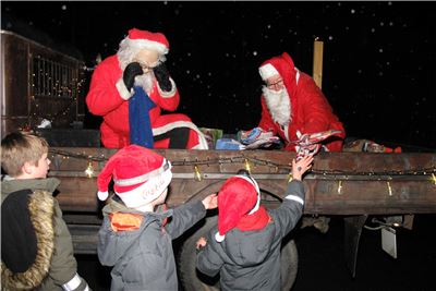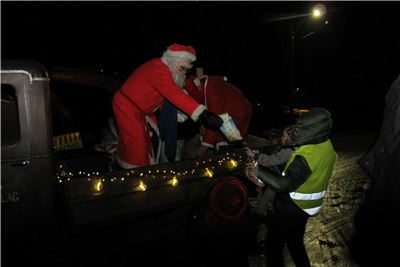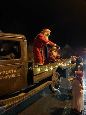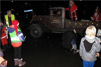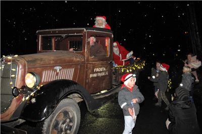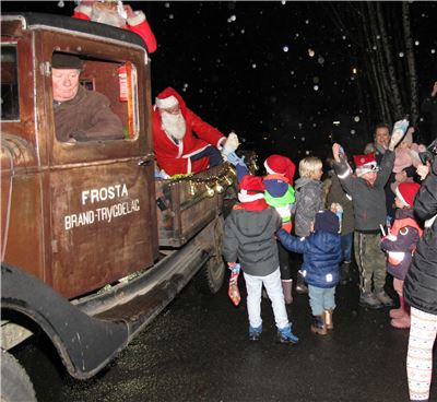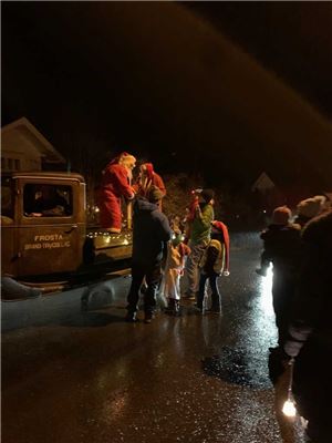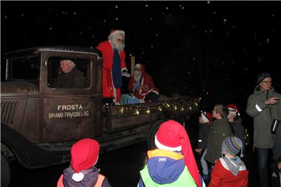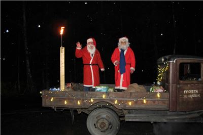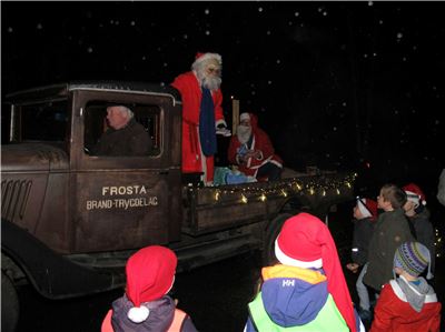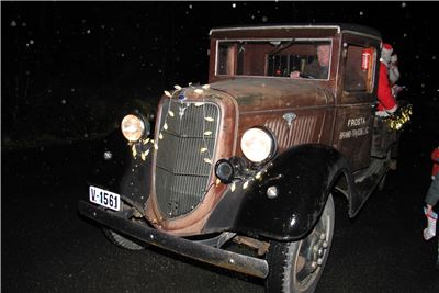 Med den gamle bilen fra "Frosta Brand-Trygdelag", utlånt fra Ramme, kjørte Torgeir Wiik julenissene trygt gjennom hovedveiene i Hvitsten. Langs ruten stod forventningsfulle barn med fakler og lys hele 13 steder. Det var to generøse julenisser som delte ut førjulsgodt til barna fra lasteplanet.